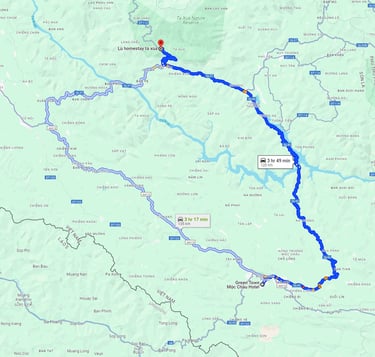 Stiklinį tiltą palikau kitam kartui. Iki šios dienos kelionės tikslo – Ta Xua nacionalinio parko – yra du maršrutai: AH13 – QL37 ir QL43 – QL37 su tuo pačiu pakilimu į kalnus DT112. Pirmas kelias yra ilgesnis, bet greitesnis. Antras – trumpesnis, bet reikės keltis per upę.