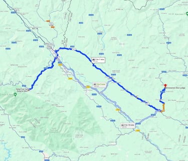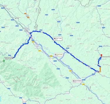 Two routes lead to my next destination, Ban Dao. I immediately dismissed CT05, a highway, and chose the slightly slower AH14 route on Google Maps. From Sa Pa, the first leg of the journey is along QL4D to Lao Cai, a city I merely passed through without much to note. The journey continued for 70 km on AH14 through a succession of towns and villages, followed by the final 18 km to Cinnamon Ecolodge on a narrower and quieter QL279, meandering through Vietnam's lush countryside.