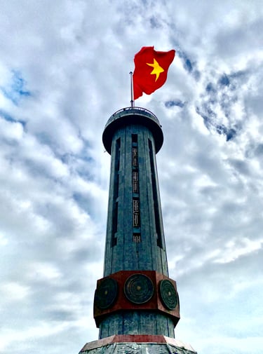 My objective for the day was to reach Lung Cu – the northernmost town in Vietnam, where the country's largest flag is hoisted. This flag spans 54 square meters, symbolically representing Vietnam's 54 ethnic groups. Climbing the pulse-quickening stone steps leads to a 33-meter-high tower with an observation platform beneath the flag. From atop, you are greeted with the customary Vietnamese spectacle of a stunning, wide-ranging natural panorama. A few kilometers to the north lies China, visible from a broad concrete highway on the Vietnamese side. This road ends as abruptly as it starts, resembling an outstretched hand towards China. Unfortunately, the Chinese haven't extended their hand in return, making the highway seem like a blunt waste of money (or misappropriation). I inquired with local tourists about the abrupt end of the highway. They explained the lack of friendly relations between Vietnam and China, citing territorial and other disputes. This also answered my earlier query about the absence of Chinese cars in Vietnam, where only Korean and Japanese models are common.