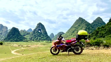 After seeing the waterfalls, I had to return to Cao Bang. I chose not to take the DT206 all the way as I had come but instead took the northern loop via DT211 to the turnoff for Thung lung Nui Thung Na Ma. I had seen online that there was a lake and a karst mountain with a hole there. I didn’t find the lake, just a short, grass-covered valley with a deeply etched stream, but the rock with the hole was there. It turns out this valley becomes a lake during the spring rains but dries up by late summer. Then, tents are set up for overnight stays, offering a romantic evening with a view of the mystical holed rock. It’s an awe-inspiring place where an hour just wasn't enough. However, the romance diminishes in the rain, and I suspect reaching it by motorbike on a wet road becomes near impossible. If you plan to go there and stay overnight, be sure to check the weather forecast.