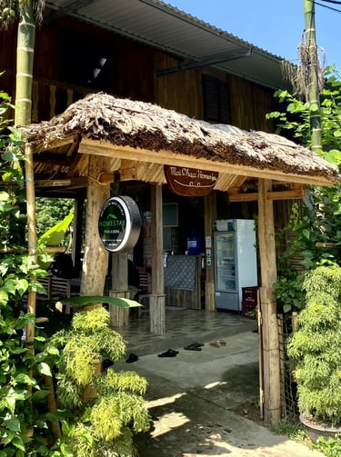 I completed the last 18 km to Mai Chau in 30 minutes without stopping or looking around much. In the town, I refueled, navigated the narrow roads, and easily found the Meadow Mai Chau guesthouse overlooking a wide rice field. A hospitable hostess greeted me, offering dinner choices from an English menu, and then escorted me to my room via wooden stairs. I had booked a room with a fan for 10 EUR a night, but remembering my morning sweat, I asked for an air-conditioned room on the first floor. For an extra 2 EUR, I got a cool, dry room with a private shower (other rooms share two shower, toilet, and washroom facilities across the terrace).