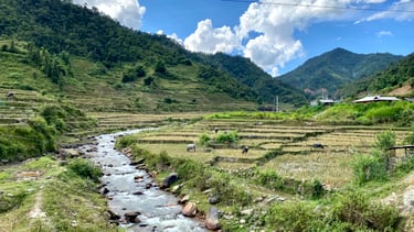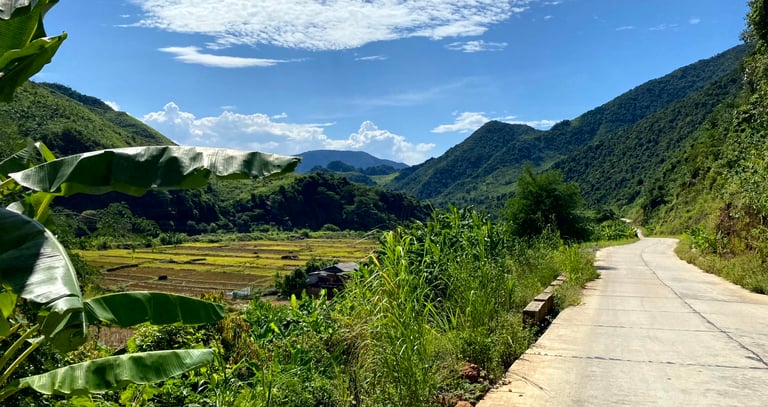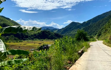 This route was exceptionally enjoyable and scenic. It featured winding paths along high mountain slopes, vast valleys, rivers, bridges, dams, and rose plantations, interspersed with desolate concrete stretches requiring steep climbs. The route passed through villages inhabited by the colorful Thai and H‘mong ethnic groups. And, at day's end, I was awestruck by the incredibly beautiful rice terraces adorning mountain sides, rolling hills, and riverbanks. I made numerous stops, overwhelmed by the beauty and regretting the need to move on. A deep yearning gripped me; I wanted to join the hard-working Vietnamese in the fields and live in a small hillside hut, waking with the sun and writing books. Resignedly, I moved on, absorbing new sights unfolding at every turn.