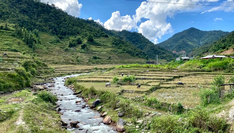 Mu Cang's guest house was the highlight of the day – a simple, affordable, two-story wooden paradise with a fish pond, cozy guest rooms, and an open terrace for solitary relaxation or engaging conversations with fellow travelers. The homestay owner invited me for dinner with his family. We sat on the floor around a steaming Lau (a pot on a gas burner for cooking soup with added meat, noodles, and vegetables). The meal also included fried spring rolls, roasted duck, and 'happy water' – a mild Vietnamese rice vodka. During dinner, the homestay owner’s eight-year-old daughter, initially shy, eventually warmed up to me, timidly tugging at my beard and inquiring in perfect English about snow. I showed her photos of Lithuanian winter and skiing trips in the Alps, introducing her to a world she had yet to explore.